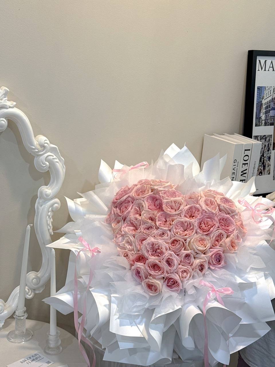 A heart-shaped bouquet of 52 stems lychee roses, elegantly wrapped in white tissue with delicate pink ribbons
