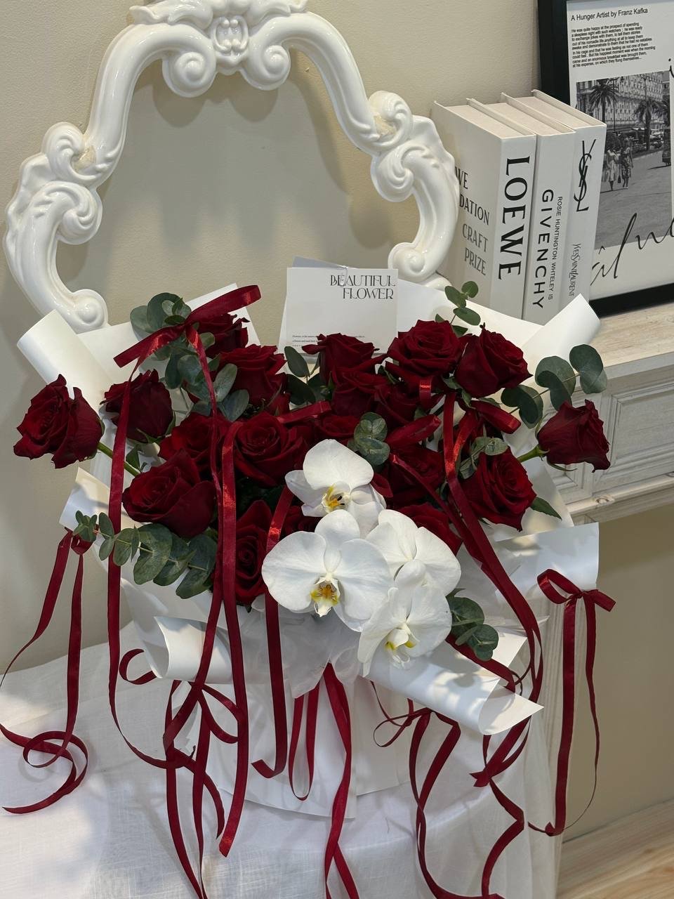 30 Stems ECD roses and white orchids with cascading ribbons — bold, romantic, unforgettable.