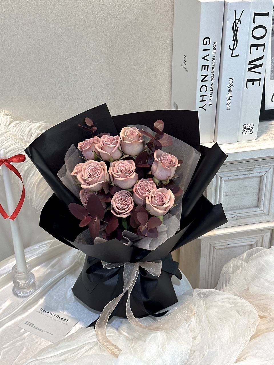 An elegant bouquet of 10 stems cuppucino roses complemented by deep-toned foliage, wrapped in sleek black layers and finished with a soft ribbon