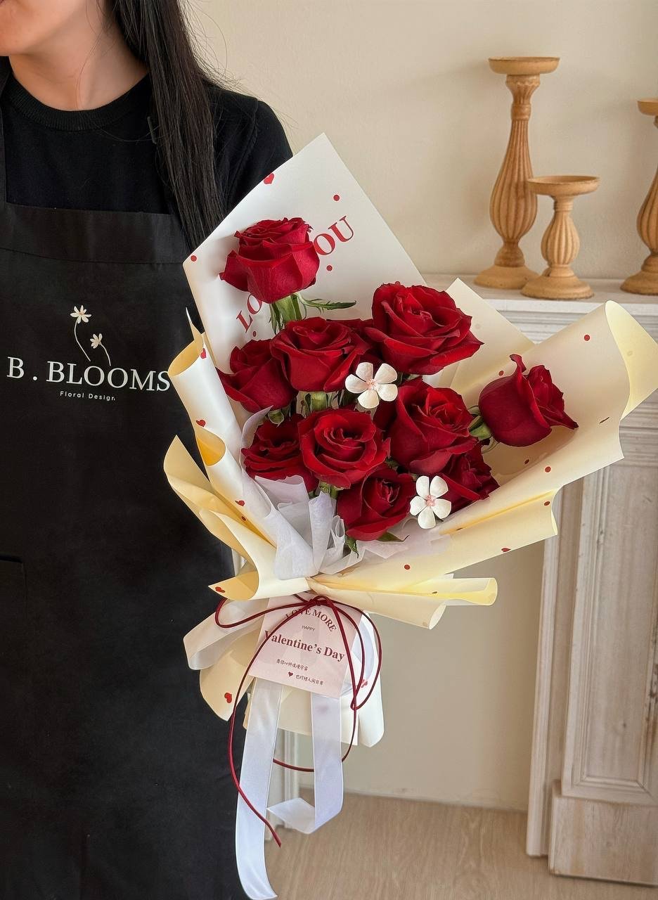 A timeless bouquet of 10 stems premium red roses, elegantly wrapped to express deep love and devotion.
