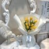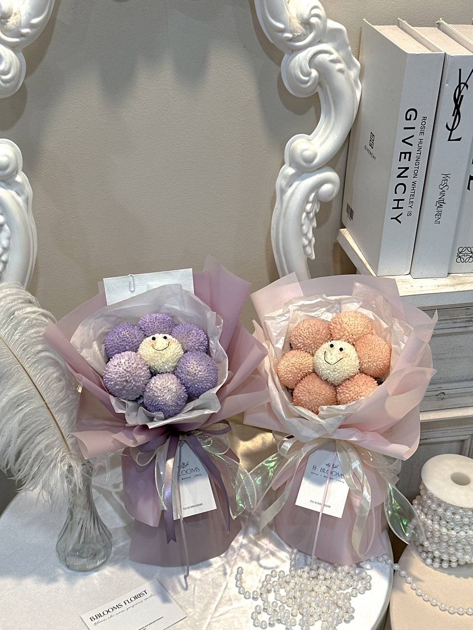 A cute pink mini bouquet featuring fluffy smiley-face blooms in soft pastel tones, wrapped with delicate layers and ribbons